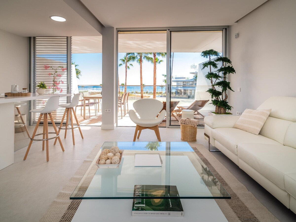 Luxury coastal living. This is The Edge, a spectacular beachfront complex in Estepona. In this spacious modern apartment with 2 terraces, you will enjoy views from every room. Three bedrooms, bright living room with kitchen and plenty of space to provide luxury holiday for up to 6 guests. The biggest plus of this complex is its own private beach access with bar and restaurant, landscaped gardens, three swimming pools, spa, gym and paddle courts in perfect harmony with the sea.