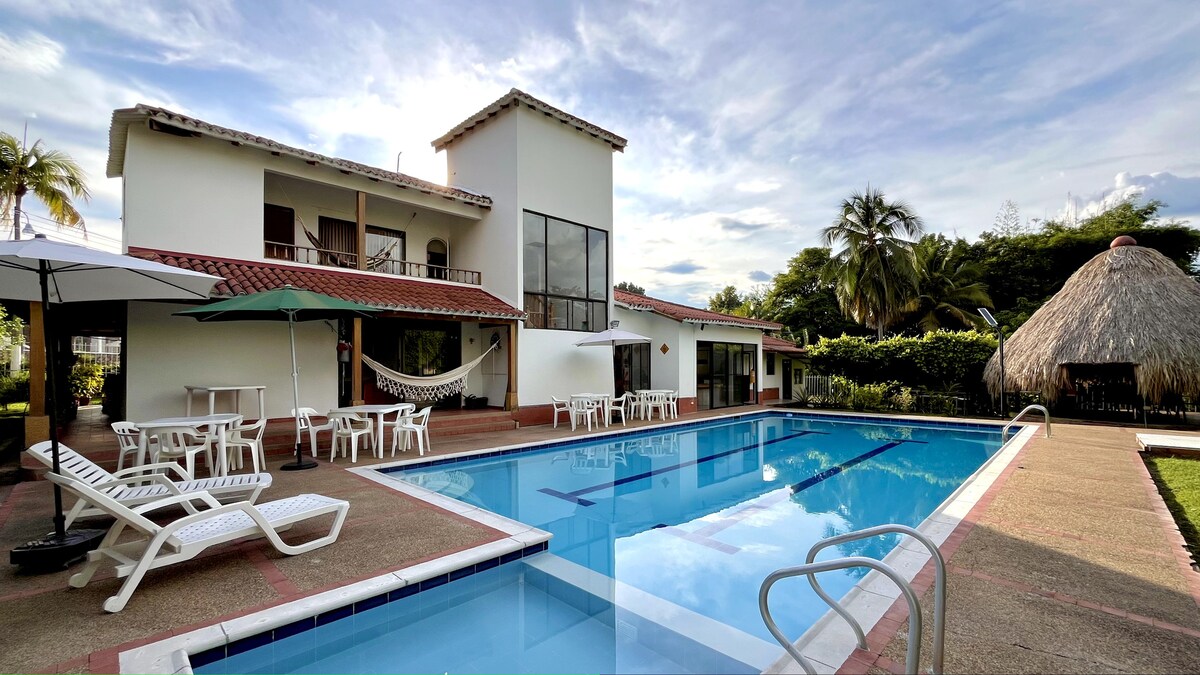 Rumah pedesaan yang modern dan luas hanya 5 menit dari Girardot. Nikmati cuaca yang indah dan cerah di rumah pribadi yang mencakup: AC dan kamar mandi pribadi di setiap kamar; kolam renang pribadi, jacuzzi, dan pemandian Turki; dapur dengan semua peralatannya; area BBQ yang beroperasi dengan kayu, gas, dan karbon; meja makan dalam dan luar; mesin cuci; area sosial yang ideal untuk rombongan besar, dengan Smart TV dan AC; gym.