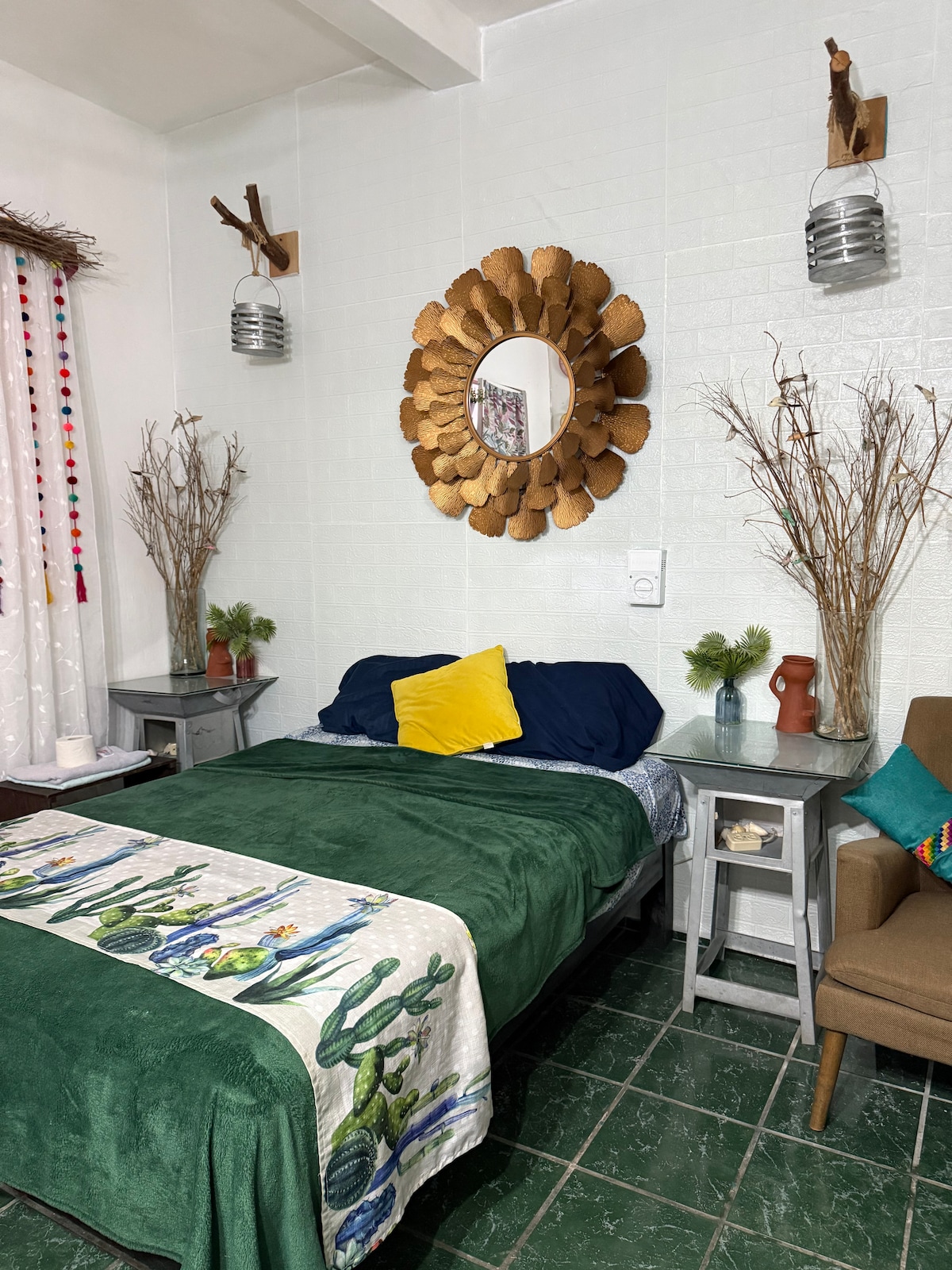 Dari seluruh akomodasi pusat dan luas ini, Anda bisa memiliki akses mudah ke segala sesuatu, di depan apartemen ada OXXO dan berjalan kaki Anda akan menemukan apotek, restoran, kafe, toko roti, toko, kerajinan, bank, masakan ekonomis, pizzeria, dll. Tempat ini memiliki: (1)Kamar dengan 1 tempat tidur berukuran king, 1 kamar mandi, AC dan TV 1 kasur udara penuh (1)Kamar tidur 1 tempat tidur berukuran king, AC dan T.V. Ruang tamu - ruang makan - dapur Dek atap dan area penatu
