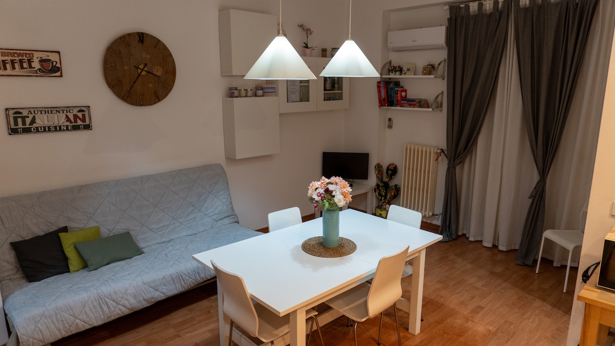 Apartemen dua kamar modern, sangat terang dan dilengkapi dengan setiap kenyamanan (AC di setiap kamar, Wi-Fi, 2 Smart TV, mesin cuci-pengering, dapur, dll.). Yang paling menonjol jelas lokasinya yang strategis, karena stasiun kereta, promenade, pusat kota, dan kota tua hanya berjarak beberapa menit berjalan kaki. Apartemen ini sangat terang berkat jendela atap dan balkon yang menghadap ke salah satu jalan paling sentral di ibu kota Apulian.
