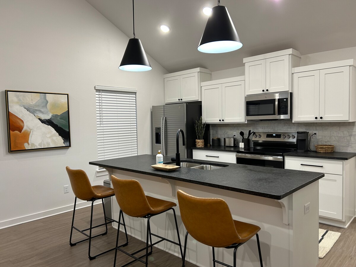 Our newest AirBNB, The Caul House, at The Porches West packs all of the features into its 1 bd, 1 bath floor plan. Open the oversized front door to the high ceilings and spacious living area. The kitchen, full of smart appliances, has a large quartz topped island. The home is outfitted with a stacked washer and dryer making laundry during your stay a breeze. Covered parking off of the back means stress free packing and unpacking during your getaway. Brand new park right outside of your back door