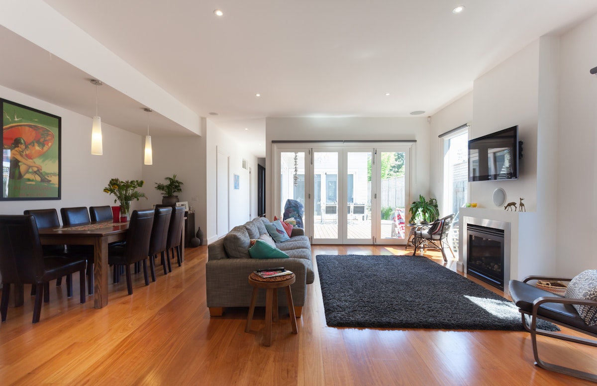 Modern spacious, light-filled townhouse with large Living and Dining area and modern fully equipped Kitchen downstairs. Upstairs huge Master Bedroom with a sitting and work area and a sunny balcony with table and chairs. Potential to sleep 2 extra guests in 2nd bedroom (available by request for an additional charge) Our home is located in a quiet tree-lined street. Only 15 minute walk to Brighton and Elwood beaches; 10 min walk to vibrant Martin Street cafe scene and Gardenvale railway Station.