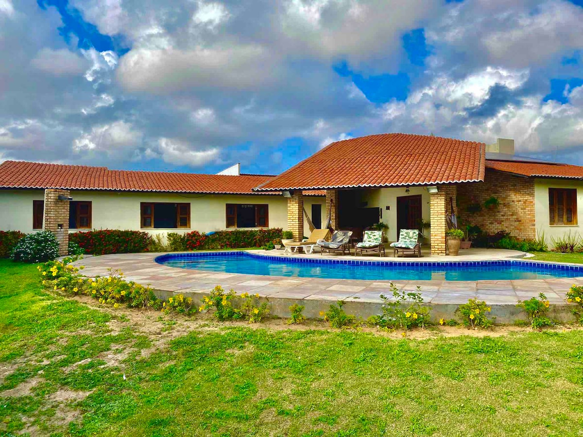 Rumah cantik yang terletak di pantai Morro Branco. Tempat ini menampung 18 orang (maksimum 21 orang, dengan 3 tambahan opsional). AC dan kamar mandi eksklusif di semua suite, ini, 02 memiliki air panas di kamar mandi. Dapur lengkap, wi - fi, ruang tamu dan meja makan yang luas. Area santai dengan halaman rumput, barbekyu, kolam renang, dan sofa istirahat. Jaraknya hanya 150 m dari pantai, di mana kios pantai (restoran) berada. Ideal untuk liburan dan beristirahat bersama keluarga dan teman - teman