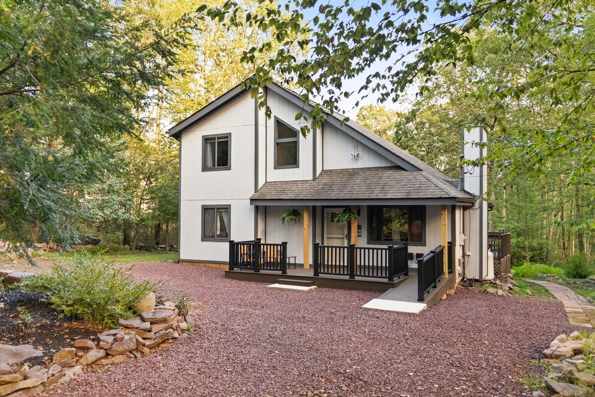Chalet 4BR/3BA yang baru direnovasi di 10 hektar hutan pribadi di Pegunungan Pocono. Dapat menampung hingga 12 tamu dan penuh dengan fasilitas: sauna, perapian dalam ruangan, perapian luar ruangan, dua stasiun kerja khusus dengan Wi - Fi cepat, ruang yoga, ruang berjemur, dan dapur lengkap. Baik Anda mencari petualangan atau relaksasi, Anda akan mendapatkan akses cepat ke tempat - tempat wisata terbaik di Pegunungan Pocono - arung jeram di Sungai Lehigh dan bermain ski di Blue Mountain, Camelback, Jack Frost, atau Bear Creek.