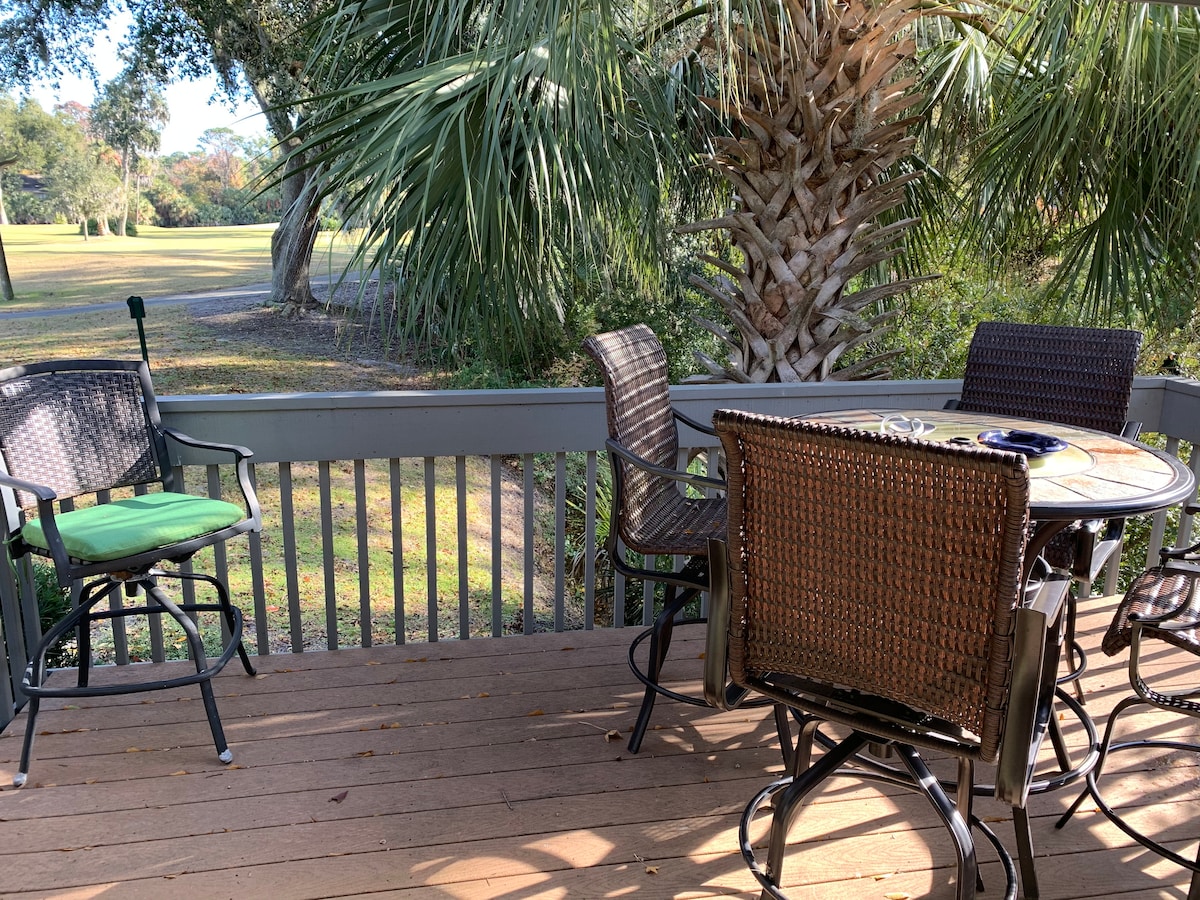 Gated Beach & Golf Resort! ✨Top 5% Airbnb Guest Favorite✨ Beach, Golf, Pool, Spa, Restaurants & Bars FREE Pickleball & Tennis – across the street HGTV Decorator designed Panoramic Golf & Lagoon Views! Big Porch Lush Landscape Tons of Wildlife Coastal Décor Sunny 1st Floor End Unit KING BED + 2 QUEENS 3 XL SmartTVs FAST WIFI & CABLE Chef's Kitchen Washer/Dryer BBQ Beach Cart, Chairs, Boogie Boards, Ice Chest Walk/Bike/Drive to Beach Walk to Golf Club & Pub Close to Coligny Summer Beach Shuttle