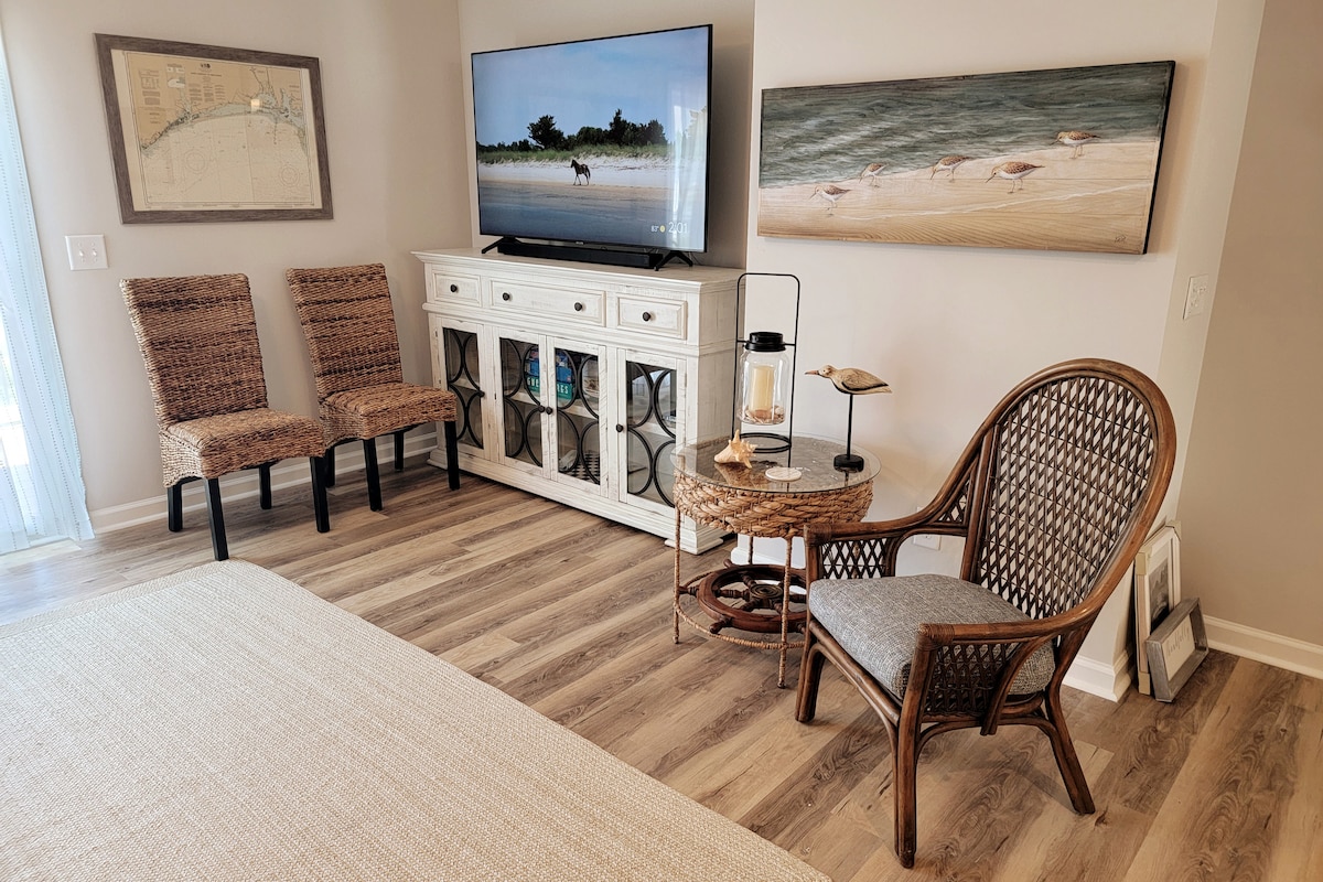 Kondominium King Bedroom Suite - Jarak Berjalan kaki ke Pantai!! Termasuk handuk tangan dan seprai. Konsep terbuka dengan cahaya alami yang luar biasa. Banyak peningkatan selama beberapa tahun terakhir, namun perubahan terbaru termasuk shiplap, membuat ruangan terasa berlapis & nyaman, liontin kuningan baru dan backsplash yang cerdas. 1 kamar tidur dengan tempat tidur king dan sofa queen pull out di ruang tamu. Komunitas berpagar di tepi laut dengan 2 kolam renang luar ruangan dan kolam renang dalam ruangan berpemanas, lapangan tenis, pemanggang, dan pusat kebugaran!