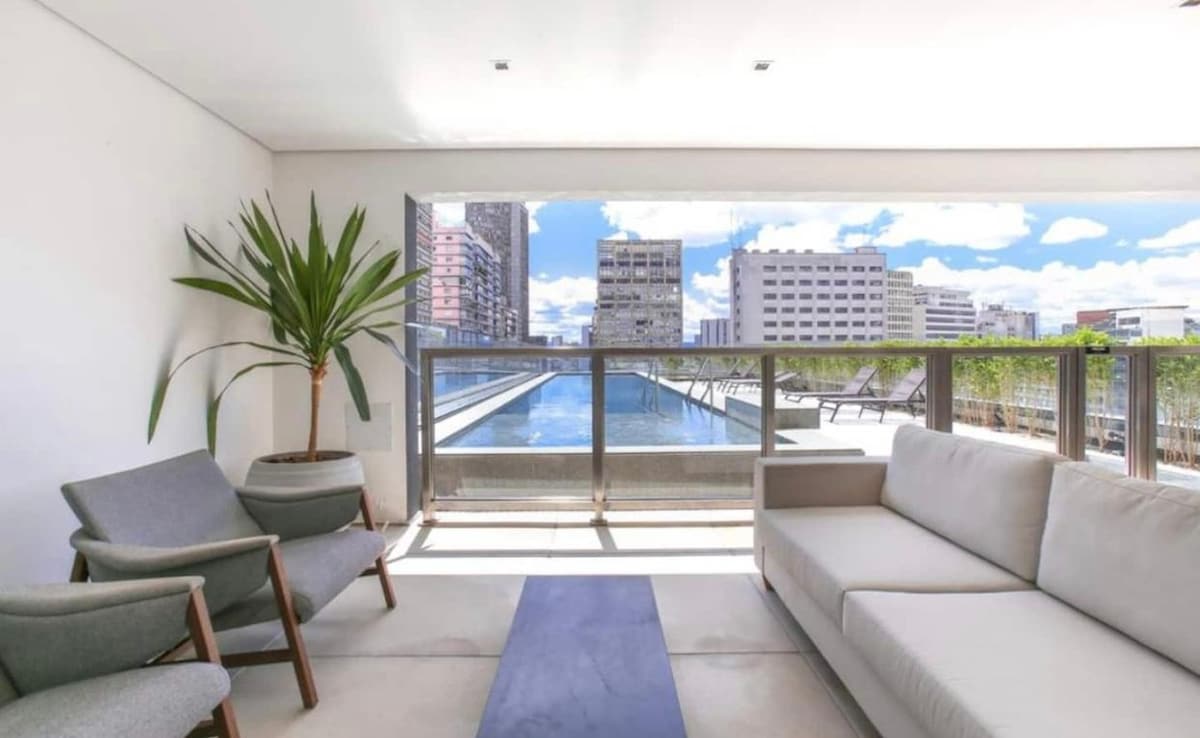 Studio modern dan nyaman, balkon, dapur kecil, AC, Smart TV, serta banyak fasilitas lainnya. terletak 300 m dari kereta bawah tanah Anhangabaú dan 500 m dari stasiun República. Dapatkan keamanan kondominium dengan kondominium 24 jam. Kolam renang, gym, dan ruang pertemuan tersedia untuk tamu. Check in mandiri! Tamu menerima kata sandi (kunci elektronik) pada hari mereka tiba.