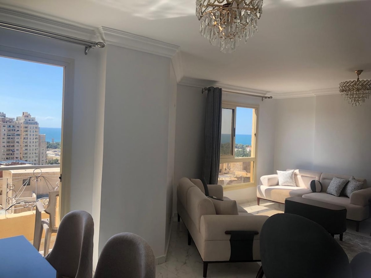 Apartemen 106m Hotel untuk disewa dilengkapi perabot setiap hari di laut langsung dengan Sidi Bishr Lantai 6, bukan yang terakhir di atas mezzanine 2, bangunan modern Dua Resepsionis 2C Kamar Mandi dan Dapur (tersedia WiFi) Kasur dan peralatan lengkap kondisi sangat baik AC finishing super mewah