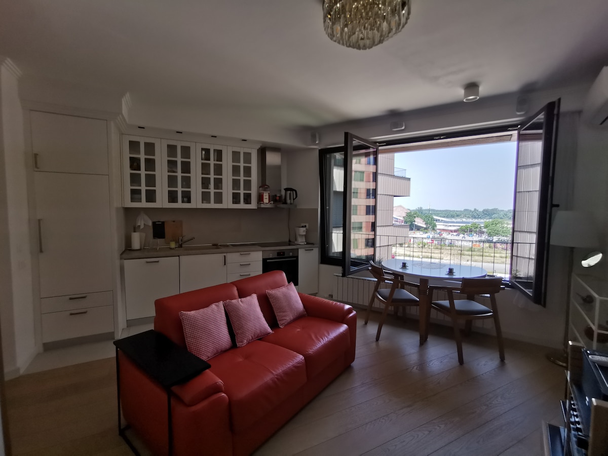 Terletak di pusat kota tua Dorcol, dekat benteng Kalemegdan (Belgrade lama) di kompleks baru K - DISTRICT yang dibangun pada tahun 2020 dengan garasi bawah tanah. Apartemen menghadap sungai Danube, beberapa menit berjalan kaki dari jalur pejalan kaki Danube, dekat dengan rute bersepeda panjang (30km) yang menghubungkan pusat kota dengan danau Ada. Di depan apartemen terdapat kolam renang yang berjarak 300 m dan pusat wellnes dekat sungai Danube. Suara audio Hi - fi, sistem 5.1 dan proyektor ultra HD dan Smart TV. Internet tidak terbatas dengan kecepatan 150mbps