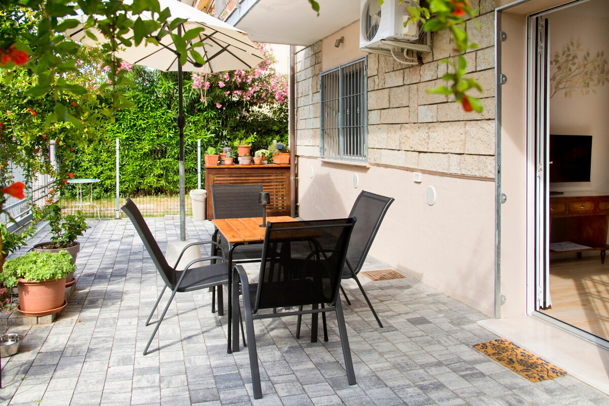 3 MENIT KE PANTAI. Lantai tiga, tidak ada lift, apartemen dua kamar tidur yang didekorasi dengan selera tinggi dengan wi - fi gratis. Pemandangan taman yang tenang di lantai atas sangat ideal untuk keluarga dengan anak - anak, pasangan, wisatawan bisnis, atau siapa saja yang mencari privasi. Terletak di bagian terbaik Rimini, kawasan Central Marina yang elegan dikelilingi oleh hotel - hotel terbaik di Riviera, dekat dengan tempat wisata utama dan hanya beberapa langkah ke pantai. Tersedia parkir di halaman serta area penyimpanan lantai dasar. Penggunaan 2 sepeda gratis.
