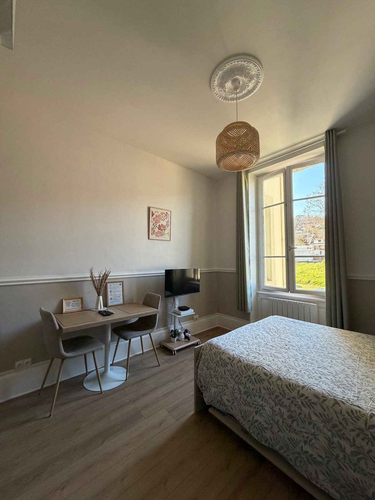 Logement élégant et central de 52m2+ terrasse privée de 20 m2 . Vue sur jardin dans "L'Albert 1er", Art Déco. Parfait pour cures, séjours touristiques ou professionnels. 1er étage avec ascenseur. 5 marches. Séjour-salon avec belle cuisine intégrée équipement complet, un îlot central pour repas. Deux canapés- lits 140 cm et 120 cm très bonnes literies. Une chambre avec lit 160 cm très bonne literie. Salle de bain avec baignoire. WC séparé. Placards. Télévision. Wifi. Chauff.elec performants.