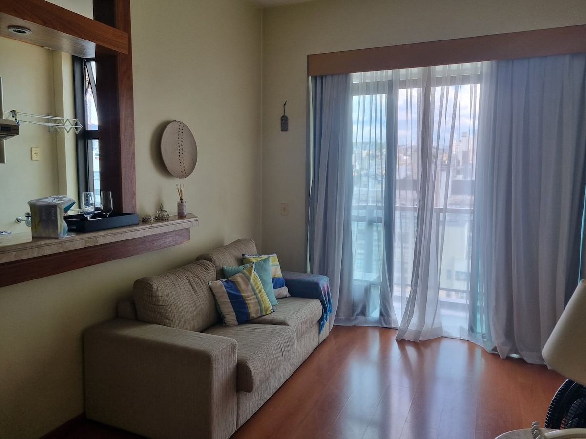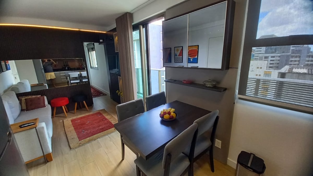Apartemen bergaya vintage industri, nyaman dan sejuk, di tengah - tengah Savassi, aureolado pilihan pariwisata dan rekreasi. Ruang tamu dengan jendela panorama, berorientasi pada senja, meja makan, sofa dan smart TV, internet 300mb - cocok untuk kantor rumah, dapur lengkap, kamar tidur dengan lemari, cermin, tempat tidur queen, dan AC. Area rekreasi dengan pusat kebugaran, sauna, dan kolam renang berpemanas di atap. Tersedia Cyber Laundry. Vaga dan concierge 24 jam.