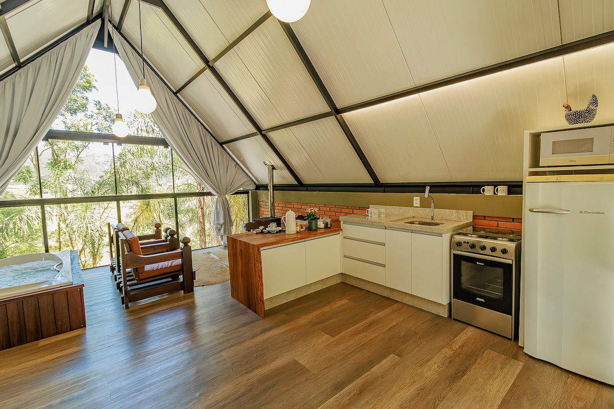 Bayangkan pondok terpencil dan pribadi di tengah alam, di atas bukit, dikelilingi oleh padang rumput, kolam, bermandikan aliran air jernih. Di sini di @refugiodosanjos.chales kami unggul dalam pengalaman yang ramah, nyaman, dan romantis dengan iklim pegunungan, kedamaian, dan kehangatan. Chalet ini dilengkapi bak mandi air panas yang dipanaskan dengan gas, barbeku dalam ruangan, kompor kayu, dan area luar ruangan di dek untuk api unggun. Kami menyediakan kayu bakar yang termasuk dalam tarif harian.