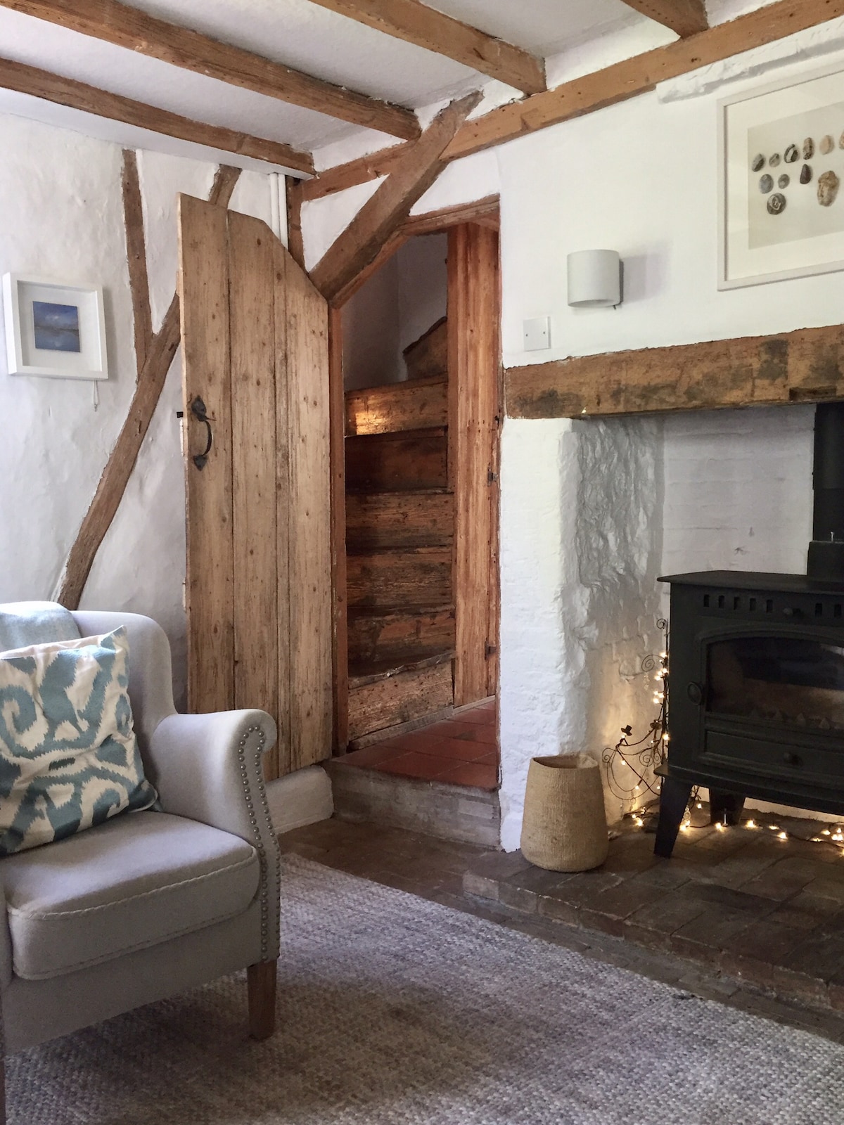 Water Meadow Cottage. A gorgeous 3-bedroom house, comfortably sleeping 6, ideal for families and anyone to unwind in all seasons. With a private south-facing garden full of flowers and birds, and secluded patio with delightful views across meadows. The stunning living room with original beams and bright windows is inviting in summer, and so cosy in winter with its wood-burning stove. Nestled in beautiful quiet countryside, a short drive from the coast, and Aldeburgh, Thorpeness, Orford.