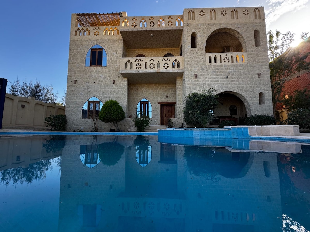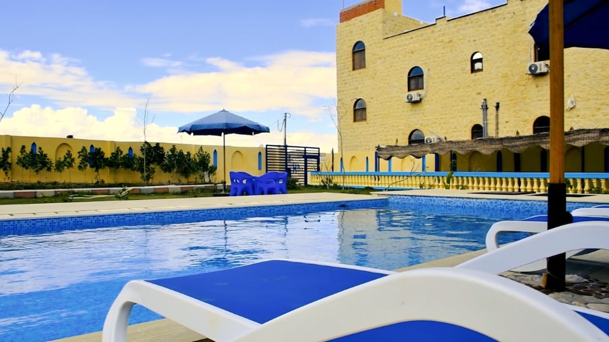 Country House terletak di Desa Tunis di Fayoum, di depan Danau Qaroun dengan pemandangan langsung ke danau. Tempat ini memiliki - 4 Kamar Tidur: *2 di lantai satu (1 kamar dengan tempat tidur twin, 1 dengan tempat tidur queen) *2 di lantai dua (1 kamar dengan tempat tidur twin, 1 dengan tempat tidur queen) - Dapur dengan semua alat ex (Mangkuk, sumpit, piring, cangkir, Oven, Kulkas, dll) -3 Kamar Mandi. - Kolam renang pribadi. - Taman pribadi dengan area pintu luar yang luas.