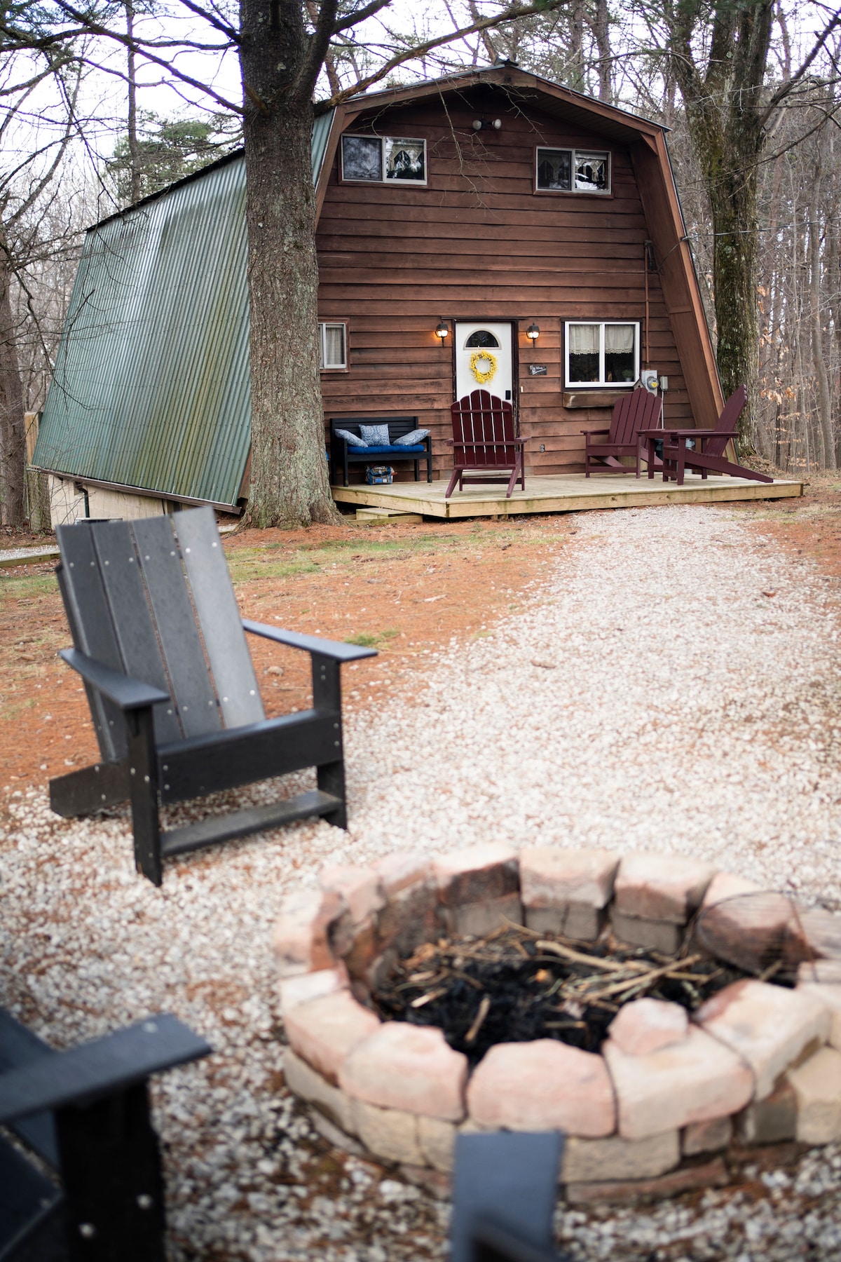 Selamat datang di kabin A - frame 4 orang kami, pelarian hutan yang damai di Hocking Hills. Permata arsitektur ini memiliki ruang tamu terbuka dengan perapian, dapur lengkap, dan jendela tinggi yang mengundang alam. Kabin ini menawarkan fasilitas modern seperti WiFi, TV pintar, dan dapur yang lengkap. Di luar, dek yang luas, bak mandi air panas pribadi, pemanggang, dan perapian menanti Anda, sehingga sangat cocok untuk bersantai di luar ruangan.