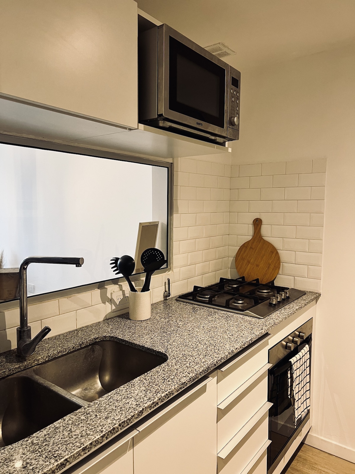 Apartemen studio eksklusif di tengah kota, sangat terang dan berfasilitas lengkap! Handuk, perlengkapan tempat tidur, bantal busa memori, pembuat kopi, kompor listrik, peralatan modern, area kerja, WiFi berkecepatan tinggi, TV pintar 43", kasur dan pegas kotak baru, setrika dengan papan, pengering rambut, ruang penyimpanan, piring keramik buatan tangan dan peralatan untuk memasak seperti di rumah. Setiap detail didekorasi dengan cermat untuk menawarkan pengalaman unik kepada Anda.