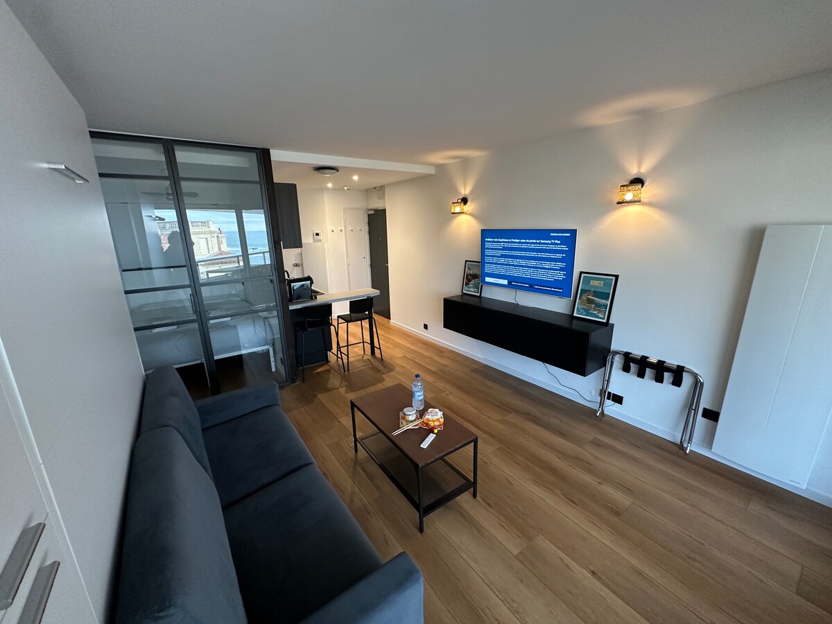 STUDIO PEMANDANGAN LAUT Studio dengan balkon, di hunian kelas atas, menghadap ke laut. Terletak di lantai 9, dengan pemandangan panorama pantai Biarritz Deskripsi: dapur lengkap, 1 tempat tidur dalam 160 cm, tv, pancuran toilet terpisah. studio untuk 2 orang Kolam renang (Juni hingga September). Kekuatan: pemandangan menakjubkan di salah satu dari sedikit studio di kediaman ini, menawarkan balkon dengan pemandangan 180 °. Lantai:Lantai Dilengkapi dengan Wi - Fi Seprai dan kebersihan ekstra sesuai dengan permintaan Tarif parkir diskon sesuai permintaan