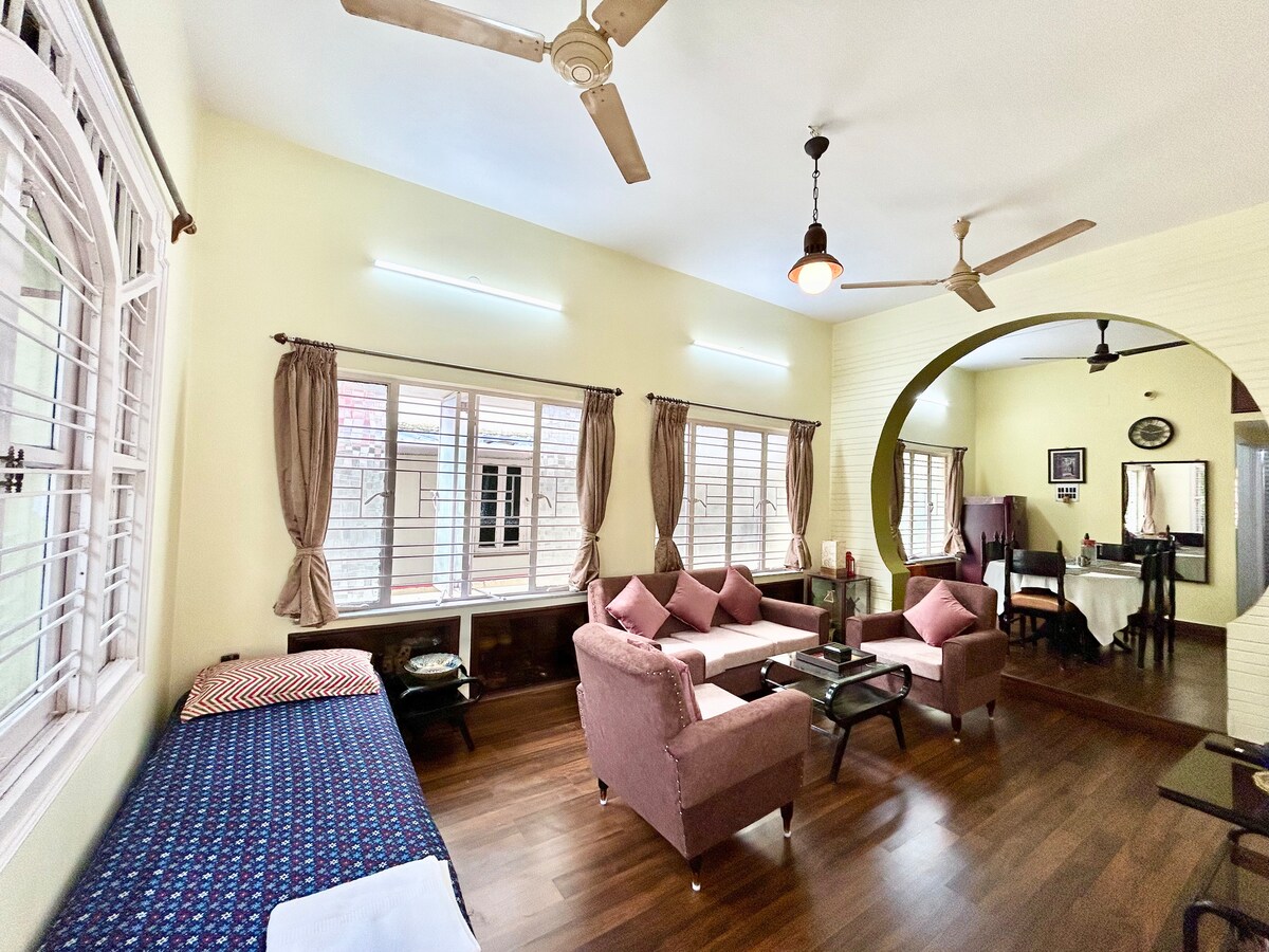 Bungalo dua lantai yang menawan di dekat BB - BC Park di Salt Lake ini memadukan kenyamanan modern dengan pesona nostalgia. Berjarak 10 menit berjalan kaki dari Pusat Kota dan berkendara singkat dari Sektor V sehingga ideal untuk liburan atau perjalanan kerja. Apartemen lantai dasar memiliki tempat tidur berukuran queen, kamar mandi dalam retro - modern, dapur lengkap & area tamu yang nyaman dengan balkon pribadi. Tamu menikmati akses aman, Wi - Fi berkecepatan tinggi, AC, TV pintar, parkir opsional, & akses teras dan makanan berbayar