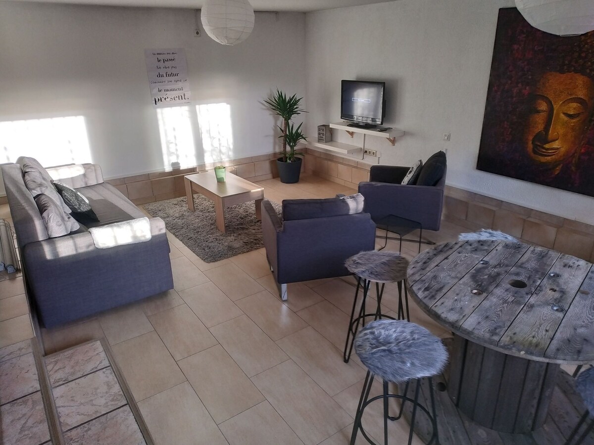 Bersantai di seluruh rumah baru ini, tenang, modern, dan sepenuhnya digital, dengan pemanas lantai. 3 kamar tidur dan 1 sofa bed, menampung hingga 8 tamu. Seprai, handuk, dan sabun disediakan. Jacuzzi besar tersedia di taman. Tersedia 2 tempat parkir pribadi gratis di depan rumah. 10 menit dari Colmar, 5 menit dari perbatasan Jerman. 30 menit dari Europa-Park. 50' dari perbatasan Swiss. Area tamu yang luas dengan dapur terbuka dan mesin kopi Nespresso.