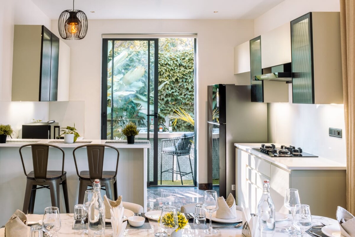 Rumah Tropis 3BHK | Lingkungan Hijau Rimbun Bersantai di apartemen 3BHK yang dirancang dengan indah di Goa dengan interior hijau yang menenangkan dan nuansa tropis yang hangat. Rumah ini memiliki tiga kamar tidur yang luas, AC, pencahayaan bergaya, dan jendela besar dengan cahaya alami yang cukup. Nikmati balkon pribadi Anda dengan sebagian pemandangan laut, menghadap pepohonan hijau yang rimbun dan Benteng Chapora yang ikonis. Cocok untuk pagi yang damai. Ideal untuk keluarga, teman, dan masa inap panjang di Goa Utara.