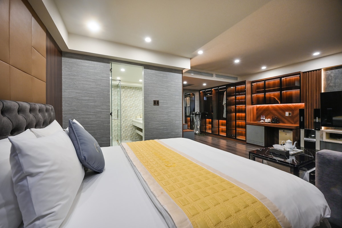 Luxury VIP Suite | Modern Comfort & Elegant Design Indulge in the ultimate comfort at our top-rated VIP suite — the most luxurious stay in the area. This spacious room features elegant wood accents, premium furnishings, a king-size bed, and a cozy living area with a large TV and sound system. The bathroom offers a modern rain shower and double sinks for your convenience. Perfect for couples or business travelers who appreciate sophistication, privacy, and style.