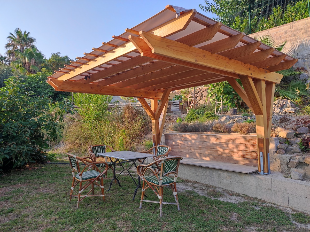 Grand appartement 80 m2 avec une chambre dans une aile indépendante de notre villla. grand jardin feerique . Aucun vis à vis. 2 piscines dont un jacuzzi , et bain suedois chauffe sur reservation. . Cadre magique. vue mer/ montagne Table extérieure terrasse couverte Terrasse piscine . Acces barbecue . cuisine : four, plaque induction lave vaisselle frigidaire Smeg. Sddouche avec toilette et seche serviette confort. poêle à bois jotul. Rideaux black out . grand ecran TV DVD . parking