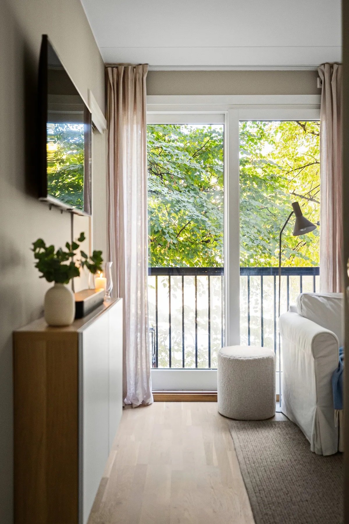 Apartemen Oslo yang cerah dengan balkon dan teras atap.