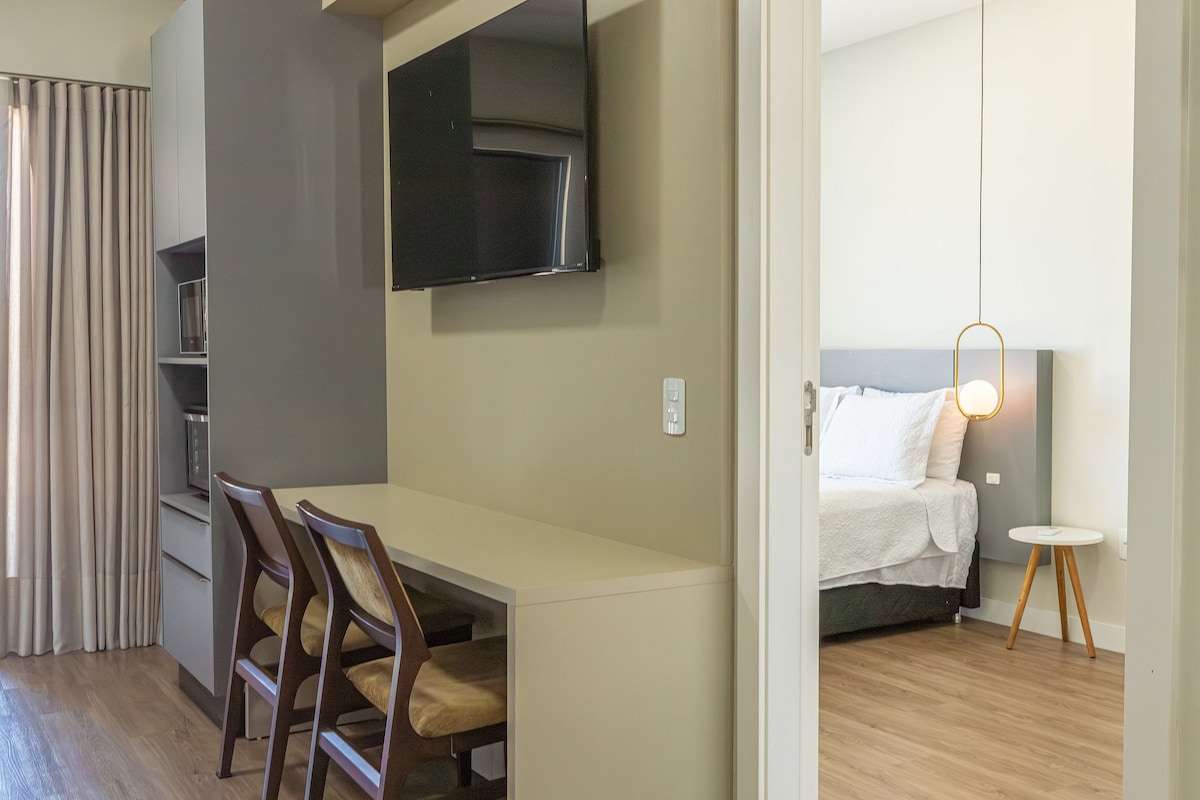 Apartemen mono ambient yang sangat baik dengan pemandangan laut panorama dan kolam renang/pusaran air Opsi yang bagus untuk liburan Anda di Bombinhas Tempat tidur kotak berukuran queen + tempat tidur single AC QeF Dapur Lengkap Smart TV Wi - Fi internet - "gratis" Garasi tertutup untuk satu mobil Kapasitas 2 orang. *SEMUA AREA FOTO BERSIFAT PRIBADI DARI APTO. *KOLAM RENANG TIDAK DIPANASKAN. *BED: NEW QUEEN SIZE MATTRESS EXTRA FIRM (HARD) OTOPEDICO MODEL D40.