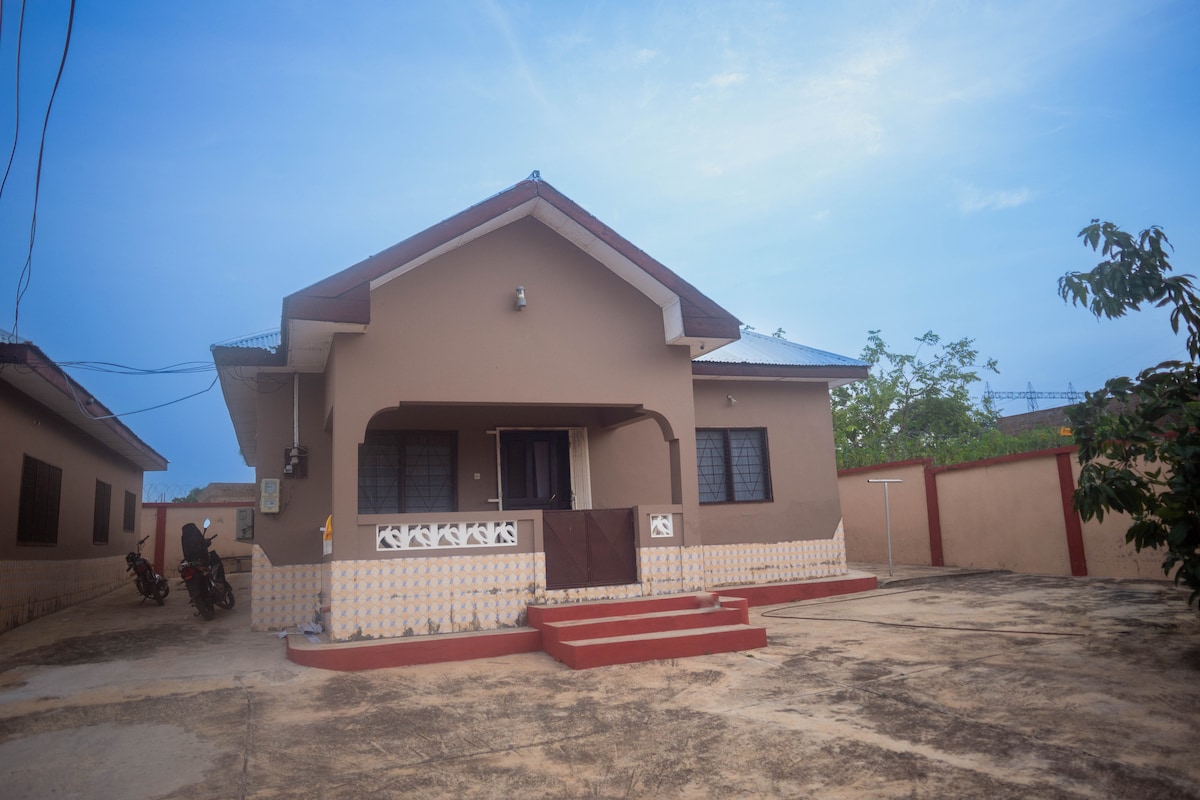 Nikmati 2 kamar tidur yang damai, 3 tempat tidur, 2 kamar mandi lengkap, ruang tamu, ruang makan, dapur berperabot lengkap, & properti aman dengan penjaga keamanan dengan dinding berpagar listrik, di seberang Air Terjun Kintampo. Berlokasi strategis beberapa menit ke semua lokasi pariwisata, properti ini adalah: 1 menit ke Air Terjun Kintampo 10 menit ke Fuller Falls 10 menit ke pusat monumen Ghana 35 menit ke gua Kunsu Slave, & benteng batu 40 menit ke suaka monyet Boabeng Fiema