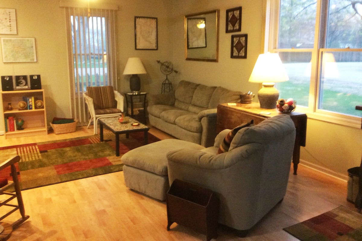 Hanya satu mil dari Seven Oaks Recreation Area! 5 mil di sebelah barat Boone tepat di luar Highway 30, tempat yang lucu dan nyaman ini menawarkan privasi kelas atas di lahan berhutan dalam waktu 30 menit dari Ames dan 50 menit dari Des Moines. Ini adalah rumah tamu di lahan yang sama dengan pemiliknya, jadi kebanggaan kepemilikan berlimpah. Tempat ini awalnya dibangun untuk orang tua pemiliknya dan dapat diakses secara universal termasuk pintu ekstra lebar, dapur yang dapat diakses sepenuhnya, dan pancuran roll - in.
