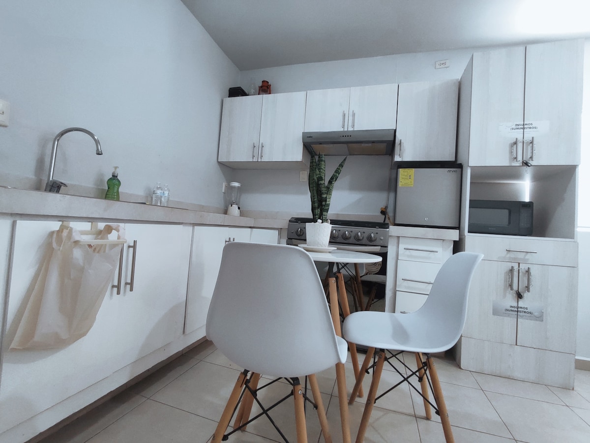 Apartemen yang nyaman, ruang terbuka dengan segala yang Anda butuhkan untuk masa inap yang menyenangkan. Terdiri dari dapur kecil namun fungsional, ruang makan, tempat tidur double, tempat tidur sofa, 1 kamar mandi lengkap, setrika, kompor, kulkas, pantry, microwave, blender, pembuat kopi, peralatan makan, boiler, minisplit, Smart TV, wi - fi, kipas alas dan Pintu Masuk Mandiri Dua setengah blok dari jalan Tampico - Mante, lokasi yang bagus, 6 hingga 8 menit dari bandara Tampico.