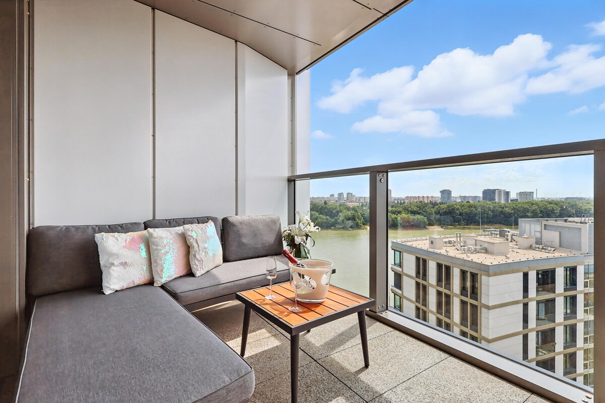 Nikmati Bratislava dari ketinggian di apartemen bergaya baru di lantai 10 gedung tertinggi di Slowakia. Flat modern dan cerah ini menawarkan pemandangan unik cakrawala kota, yang akan Anda sukai saat matahari terbit dan segelas anggur di malam hari. Apartemen ini berlokasi di kompleks bergengsi EUROVEA, tepat di tepi sungai Danube. Di gedung ini Anda memiliki koneksi langsung ke pusat perbelanjaan di mana Anda bisa menemukan restoran, kafe, toko, bioskop, pusat kebugaran, dan semua layanan biasa – dry foot.