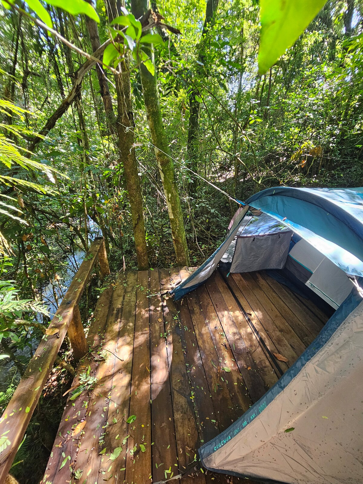 Uma experiência incrível e diferente de dormir e acordar em meio a uma abundante Natureza e seus sons, ao lado de nosso paradisíaco rio de pedras. Nossa estrutura inclui uma barraca Quechua completa, em um tablado suspenso, com vista para o rio. Além de possuir banheiro, cozinha e restaurante nas áreas superiores de nossa ecofazenda. O Bosque onde está montada essa barraca, fica em um local fica mais isolado do restante da fazenda (200mt).