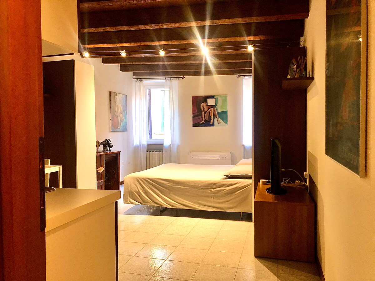 Apartemen studio besar di lantai dasar, dengan pintu masuk independen. Terdiri dari ruang tamu dengan dapur lengkap, tempat tidur sofa tunggal dan 1/2, dua tempat tidur single. TV 52"dengan netflix, AC, kipas angin, wifi gratis. Parkir umum gratis. Dekat dengan restoran pizza, kedai es krim, supermarket. Dilayani oleh bus yang membawa Anda ke pusat kota. Jendela ganda di bagian belakang untuk jalur kereta api. Harap perhatikan bahwa pajak turis di Verona harus dibayarkan kepada tuan rumah.