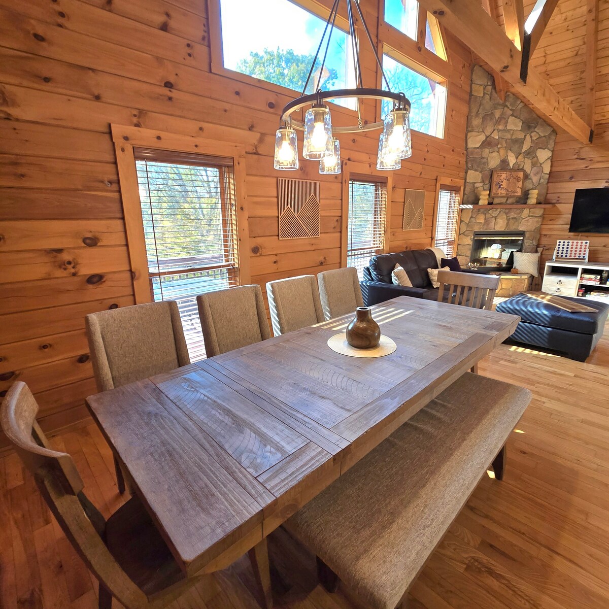 Kabin liburan keluarga ganda yang baru direnovasi mengakomodasi hingga 16 tamu! Tersesat dalam kemewahan pedesaan tempat peristirahatan yang luas ini, menampilkan ruang tamu ganda, 2 dapur, 5 kamar tidur ditambah ranjang loteng dan ruang permainan! Nikmati pemandangan hutan danau dari teras dek multi - tier atau jelajahi batu tebing alami di sepanjang jalur pribadi menuju danau. Tamu bisa memancing, kayak, papan dayung, dan berenang langsung dari garis pantai properti! Terletak hanya 1 jam dari Louisville, Mammoth Cave dan Holiday World.