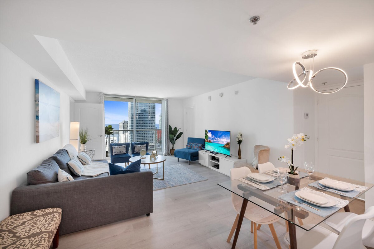 Enjoy this centrally-located Penthouse (42nd floor.high ceilings) in the heart of Miami. Mins 2 Bkll City Center, Beaches, Design D, wynwood, n Best restaurants.Tastefully Remodeled n Furnished, Sparkling CLEAN, BRIGHT, modern 1bed 1bath w Amazing CITY VIEWS n Partial Ocean views. Fully equipped Kitchen, Laundry, Cooler n Beach Chairs. King bed n Sofa b. Smart darkening Shade 4 Long nights.Smoking, Pets n Events NOT allowed. Guest must send identification n e-mail to sign registration.