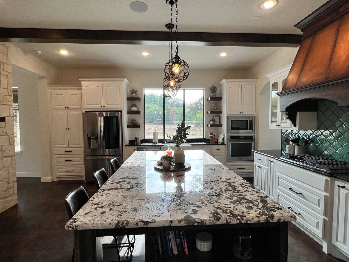 The Eagle House adalah bangunan baru yang menyambut dan memberikan suasana modern, bersahaja, dan mewah. Rumah pribadi besar ini memiliki 3 kamar tidur, 3 kamar mandi lengkap, kantor pribadi, teras, dan area berumput luar ruangan yang luas. Satu mil dari Eagle Mountain Lake, tamu dapat menikmati jalur yang dipagari pepohonan, lapangan tenis, dermaga perahu, dan area piknik tepi laut yang semuanya mudah diakses dan gratis. Downtown Fort Worth, museum kelas dunia, pusat perbelanjaan, bersantap, dan Stockyards yang bersejarah hanya berjarak lebih dari 30 menit berkendara.