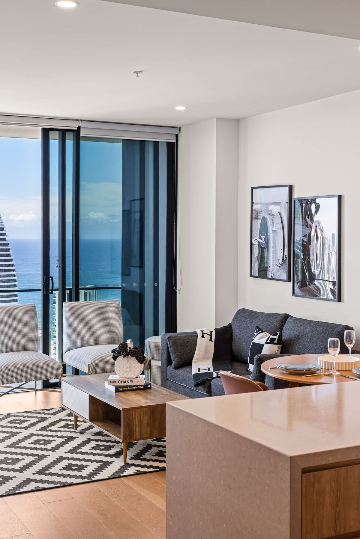 Our premium two-bedroom, two-bathroom luxury ocean apartment is located on level 26 in Oracle Tower 1. Boasting the most incredible panoramic view of the ocean and southern coastline, our apartment is sure to impress. If the photos look spectacular, wait until you experience the views in person. Oracle is situated right in the heart of beautiful Broadbeach, surrounded by the best beaches, parks, shops, cafes, and restaurants. We can’t wait to welcome you to our slice of paradise in Broadbeach.