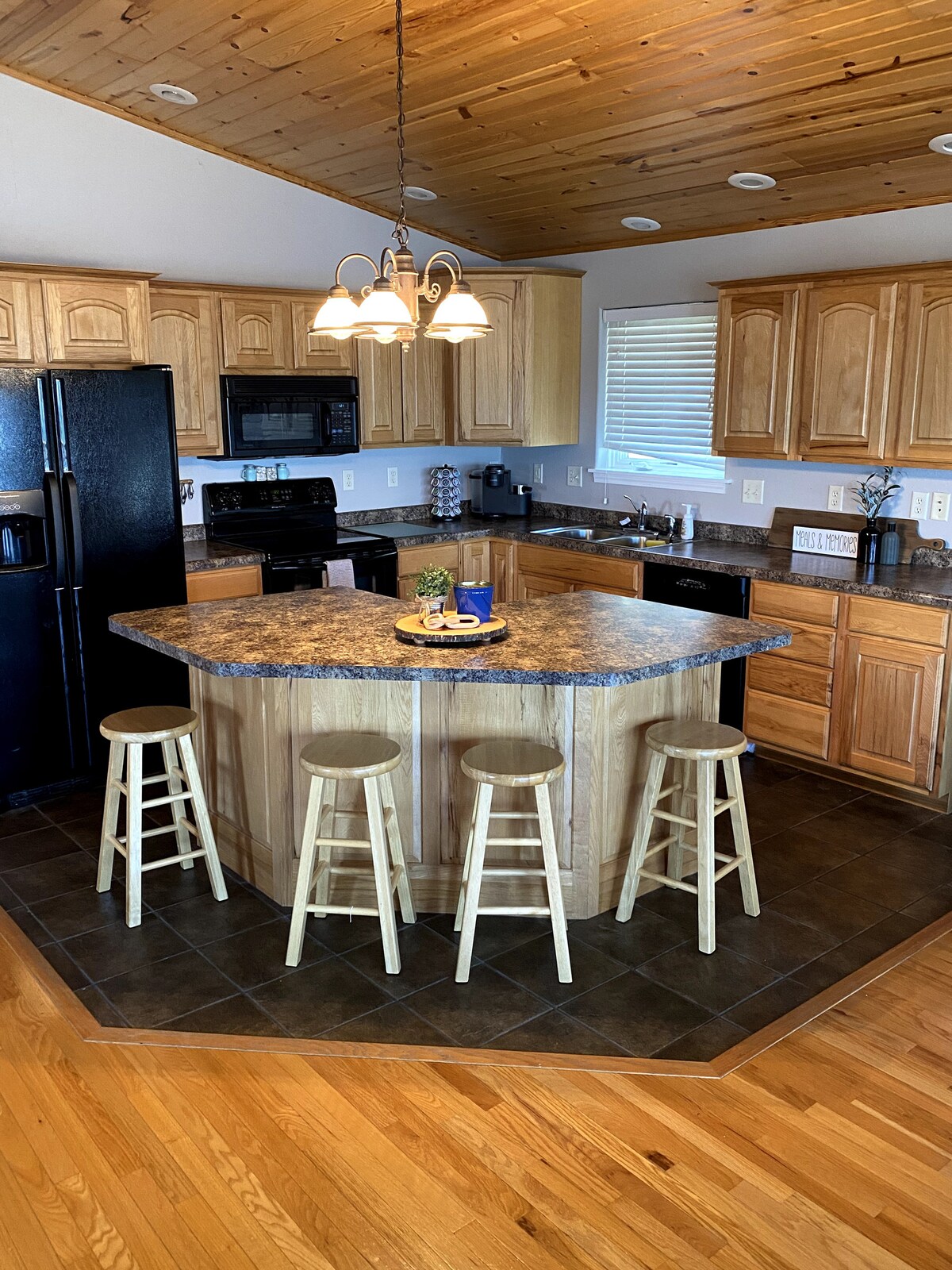 A four bedroom home: two rooms have a king (one is in the basement and is available for stays with more than four guests) and the other rooms upstairs have a queen in one and two extended twins in the other. The dining, living, and kitchen areas provide guests with a clean modern space for gathering. The basement has a ping-pong table, laundry and a second full bath room. The house also has a four person hot tub available year round.