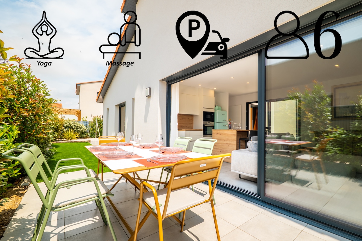 House of 50 m2 direnovasi total dengan di satu sisi teras dan di sisi lain teras termasuk barbekyu dan pancuran luar ruangan (sangat nyaman untuk kembali ke pantai!). Rumah ini berlokasi 300m dari pantai. Terletak di daerah yang tenang dan dekat dengan pertokoan, restoran, toko roti, apotek. Parkir di taman atau di luar rumah.