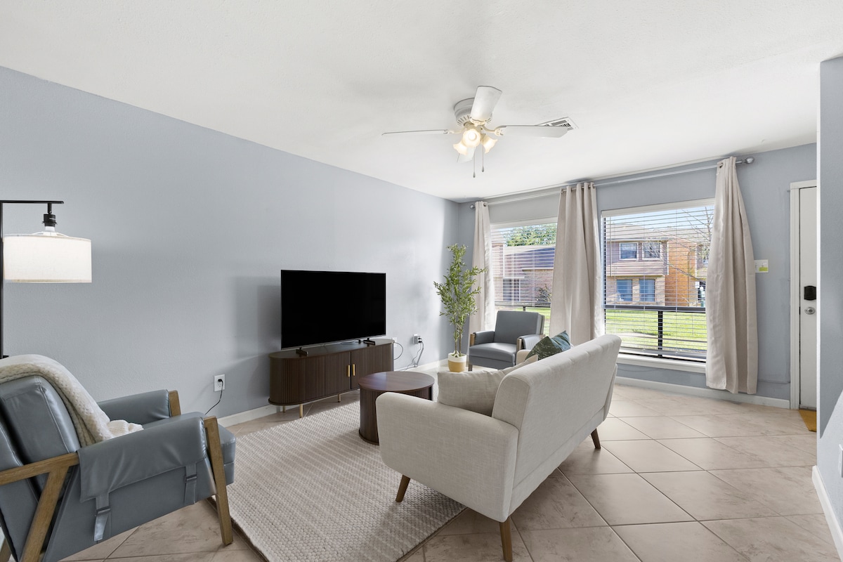 Townhouse berperabot bergaya seluas 1.200 ini sangat cocok untuk perayaan Aggie seperti kelulusan, Family Weekend, Ring Day, Howdy Week, Whoopin ' Weekend, konferensi, dan tentu saja, sepak bola Aggie dan Midnight Yell! *PEMBERITAHUAN KEBISINGAN*: Konstruksi berdekatan dengan properti hingga September 2025. Selain itu, jalur kereta api dalam jarak 200' dari townhouse. 1 tempat tidur King, 2 tempat tidur Queen, semuanya dengan kamar mandi en suite. Maaf - TIDAK DIIZINKAN MEMBAWA HEWAN PELIHARAAN. Diskon 40% diterapkan secara otomatis untuk masa inap jangka panjang, >28 hari. IZIN#: STR2022-000051