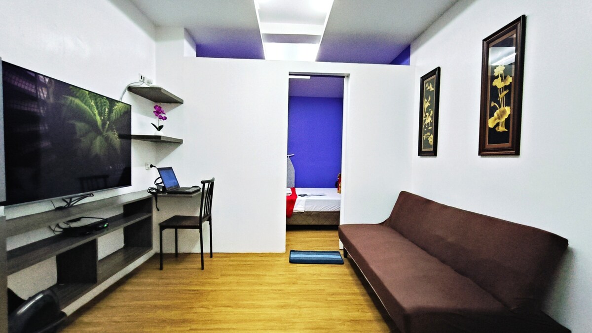 Selamat datang di JD Serviced Suite di Azure North! Nikmati masa inap yang mulus dengan smart lock check - in mandiri. Unit 1 kamar tidur kami mengakomodasi 4 tamu dengan tempat tidur queen, tempat tidur sofa, dan balkon di sekelilingnya. Berlokasi strategis 5 menit dari SM Pampanga dan Robinsons Starmills (15 menit berjalan kaki) & 30 menit dari Bandara Internasional Clark. ‼️Akses kolam renang sebesar ₱200/shift, dibayarkan oleh tamu, tutup setiap hari Selasa (begitu dibuka kembali). Nama lengkap semua tamu yang diperlukan saat memesan.