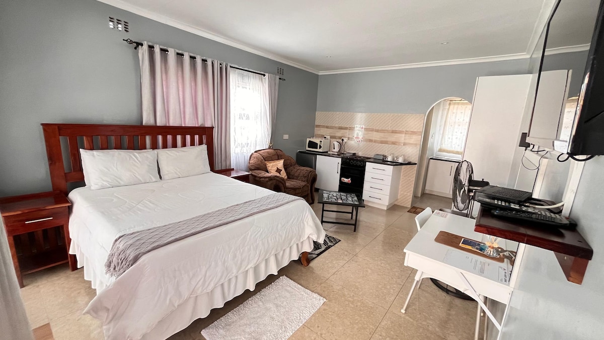 Lupakan kekhawatiran Anda di tempat yang luas dan tenang ini yang terletak di Fourwinds . Dengan sistem daya cadangan jika terjadi pelepasan muatan. Shower & kamar mandi internet Wi - Fi gratis Dapur kecil dengan 4 kompor piring (2Gas & 2 listrik) dengan oven & oven microwave untuk kebutuhan dasar Anda Silinder Gas HANYA tersedia atas permintaan. Dstv & tampilan terbuka untuk Hiburan Anda kulkas Cutlery Kettle Cups Meja setrika & setrika uap