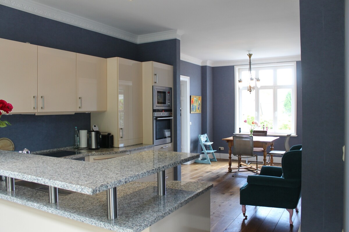 Halo dan selamat datang di apartemen kami di Dänschendorf di Fehmarn. Baru-baru ini direnovasi sepenuhnya, apartemen di rumah kapten tua ini memenuhi semua kebutuhan. Di 100m² Anda memiliki ruang untuk 6 orang di 3 kamar tidur dengan tempat tidur double. Di malam hari di depan perapian, di sauna barel di taman atau di teras kami langsung di danau, Anda bisa bersantai setelah hari yang penuh peristiwa. Internet fiber-optic memastikan Wi-Fi yang sempurna. Sampai jumpa!