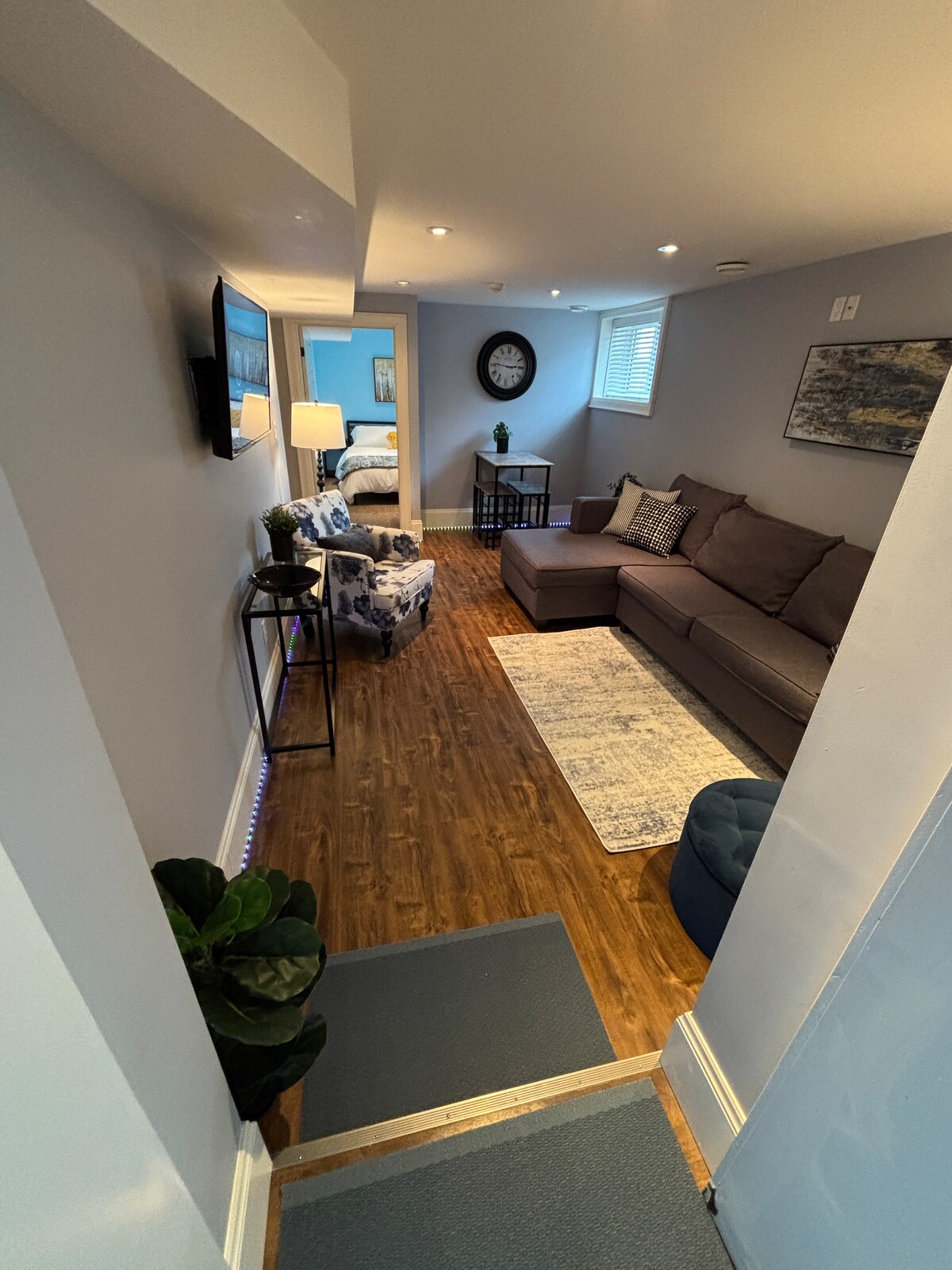 Selamat datang di apartemen bawah tanah kami yang nyaman! Airbnb modern ini berada di lingkungan perumahan yang tenang 40 menit berkendara dari pusat kota Toronto dan satu jam dari Niagara Falls. Ruang yang cukup terang ini memiliki tempat tidur berukuran queen yang nyaman, penyimpanan yang cukup di lemari yang luas, dan interior yang dirancang dengan indah dengan cahaya alami yang membanjiri jendela besar. Catatan: Kami memiliki 2 kasur lipat tunggal yang tersedia untuk ditempatkan di lantai di ruang tamu. Seprai dan bantal ekstra tersedia.