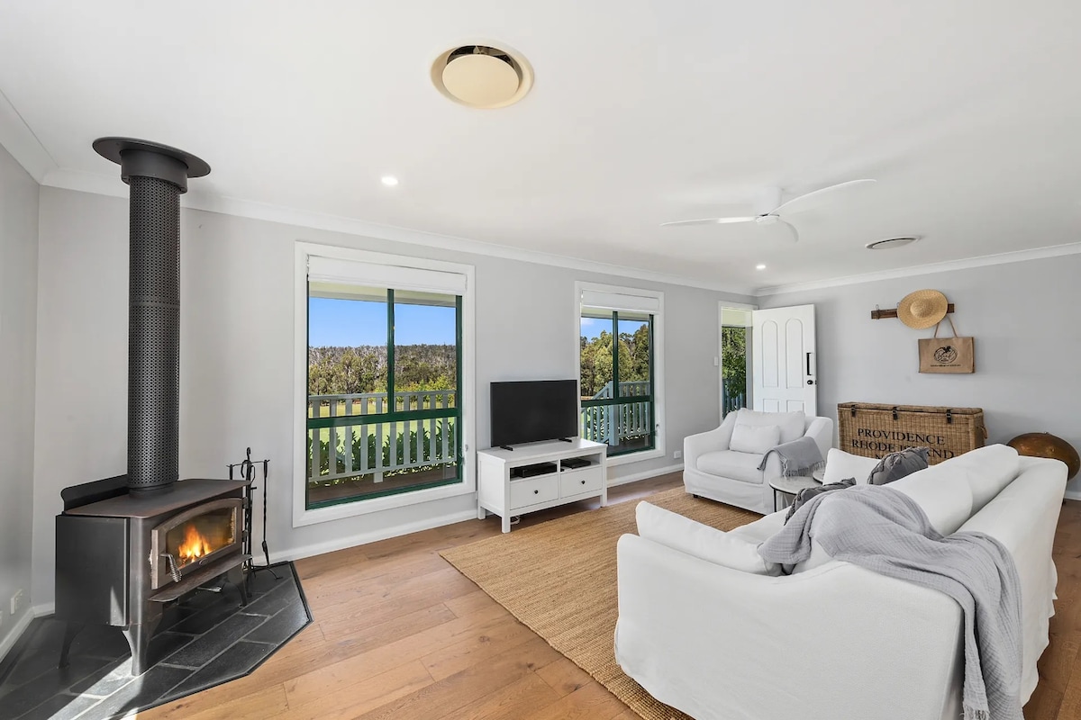 Terletak di properti ternak seluas 350 hektar 10 menit dari Moss Vale, Anda akan menemukan pondok bergaya Hampton yang dibangun dengan tujuan ini. Dengan garasi yang terhubung dengan 2 mobil dan perapian batu pasir dalam/luar ruangan, tempat ini terdiri dari 2 kamar tidur king besar yang masing - masing dilengkapi jubah walk - in dan ensuite. Ada AC, dapur berperabot lengkap, ruang makan terbuka, penatu tersembunyi, teras makan luar ruangan, kursi ayunan dan BBQ. Cocok untuk 2 pasangan atau keluarga 4 atau 5 orang. Kirimkan pesan kepada saya untuk masa inap berdurasi lebih panjang.