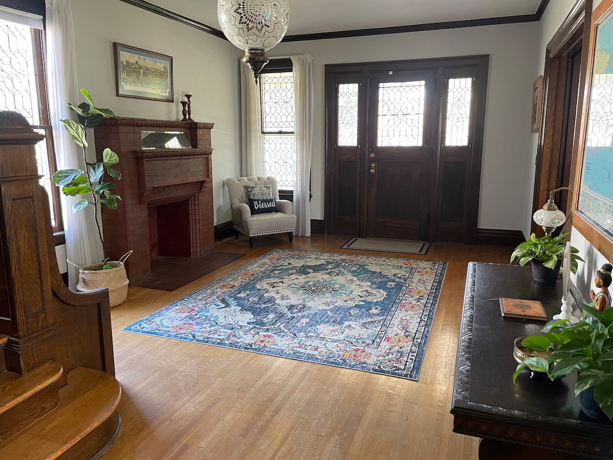 A harmonious balance of old & new. A space honoring its history while offering modern comfort. ✨New appliances, lighting, windows, HVAC, washer/dryer ✨2 TVs, including portable 55” - perfect for gaming ✨Original floors, tub, fireplace, trim; Large porch ✨Adjacent to restaurants, grocery & convenience stores ✨Walk 1 mile to Arena, shopping, movies, riverfront & parks ✨7 mins from Marshall, <10 mins from hospitals ✨Dog friendly fee per pet/night; max 2 dogs 💡Dining area can be used as 3rd bedroom