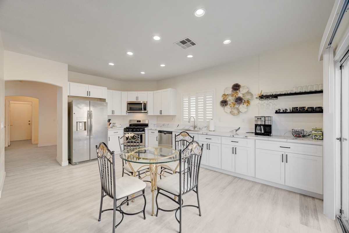 Selamat datang di rumah modern seluas 3400 kaki persegi yang telah direnovasi sepenuhnya! Pemandangan dari halaman belakang, kamar tidur utama, dan ruang tamu. Sangat luas dan mengakomodasi hingga 12 orang dengan nyaman. Kolam renang dan jacuzzi yang dapat dipanaskan sepanjang 40 kaki. Lapangan basket, lapangan golf hijau dan pulau dapur besar. Memiliki 5 kamar tidur dengan 4 di antaranya memiliki kamar mandi pribadi di suite. Internet berkecepatan tinggi dan berlangganan kabel dasar. Setiap Kamar Tidur memiliki smart TV sendiri dan ruang tamu memiliki smart TV yang besar.