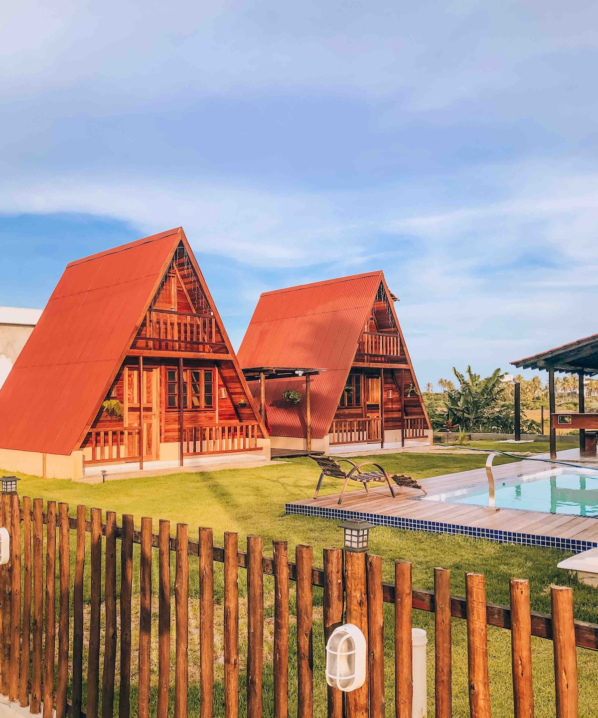 Chalet dengan kolam renang, berdiri di pasir di Jacuípe